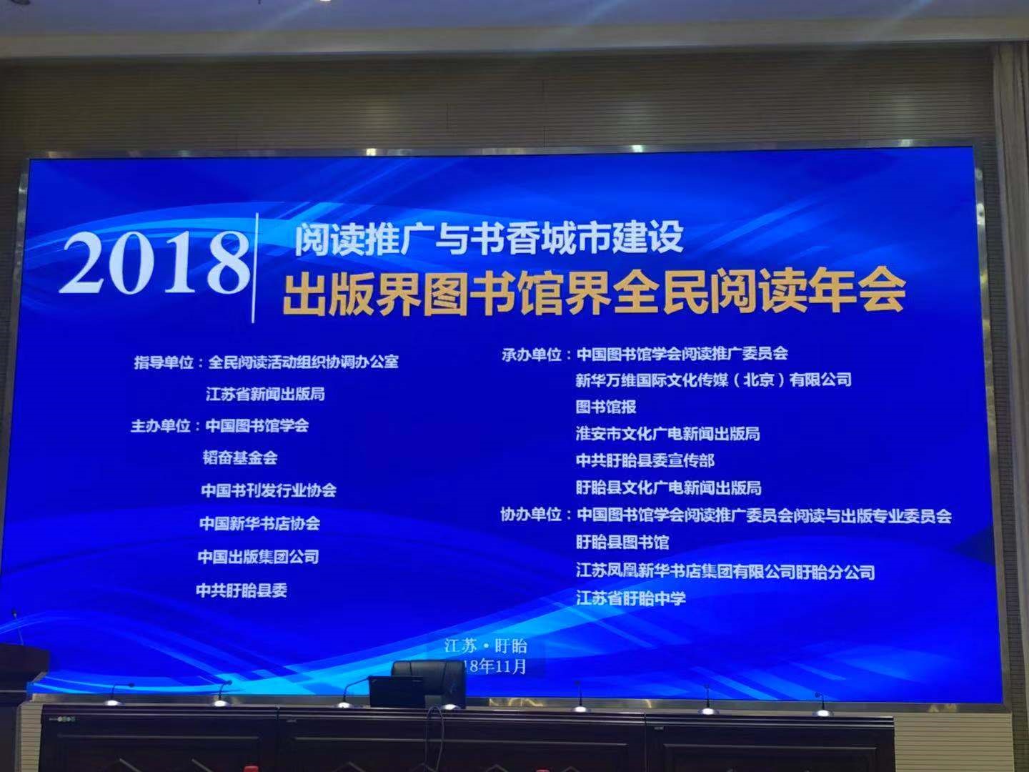 1123日,由中國(guó)圖書館學(xué)會(huì)、韜奮基金會(huì)、中國(guó)書刊發(fā)行業(yè)協(xié)會(huì)、中國(guó)新華書店協(xié)會(huì)、中國(guó)出版集團(tuán)公司主辦的“2018出版界圖書館界全民閱讀年會(huì)”在江蘇盱眙舉辦。本屆年會(huì)以“閱讀推廣與書香城市建設(shè)”為主題,邀請(qǐng)出版界、發(fā)行界、圖書館界200余位嘉賓出席,為推進(jìn)全民閱讀建言獻(xiàn)策。