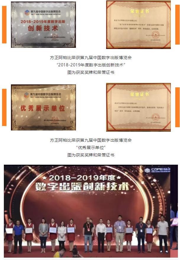 方正阿帕比榮獲第九屆中國數(shù)字出版博覽會(huì)“2018-2019 年度數(shù)字出版創(chuàng)新技術(shù)”圖為獲獎(jiǎng)獎(jiǎng)牌和榮譽(yù)證書